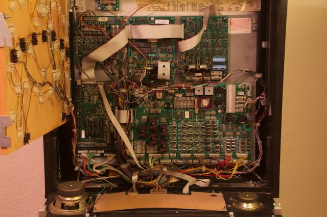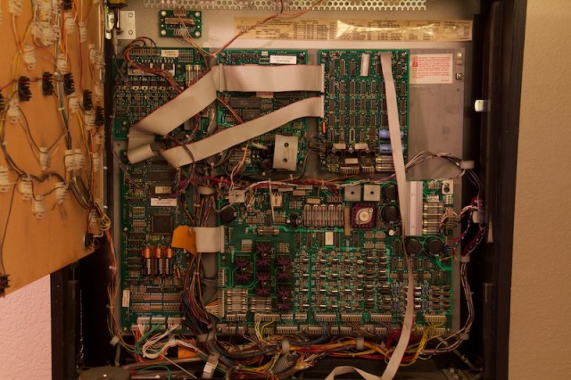 First, let’s look at Doctor Who before making any modifications. The main things to see here are the CPU board on the lower left (the one with the three Duracell AA batteries), and the power driver board on the lower right. Note as well that the DMD (not visible, below the power driver board) is connected to the PCB at the top right via a thin ribbon cable.