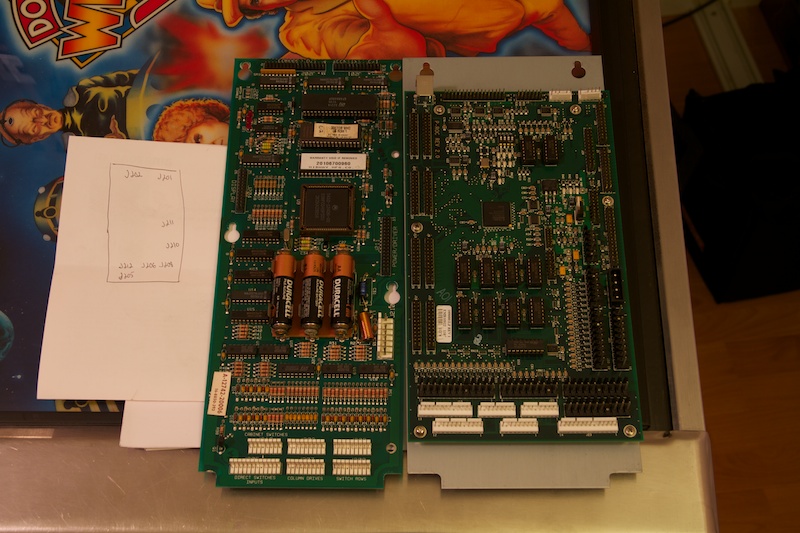 I took note of all connectors that were connected on the CPU board. These connectors will need to be transferred to the appropriate location on the P-ROC board. I then disconnected everything from the WPC CPU board, and pulled it from the machine. Here is the stock WPC CPU board (left) next to the P-ROC (right).