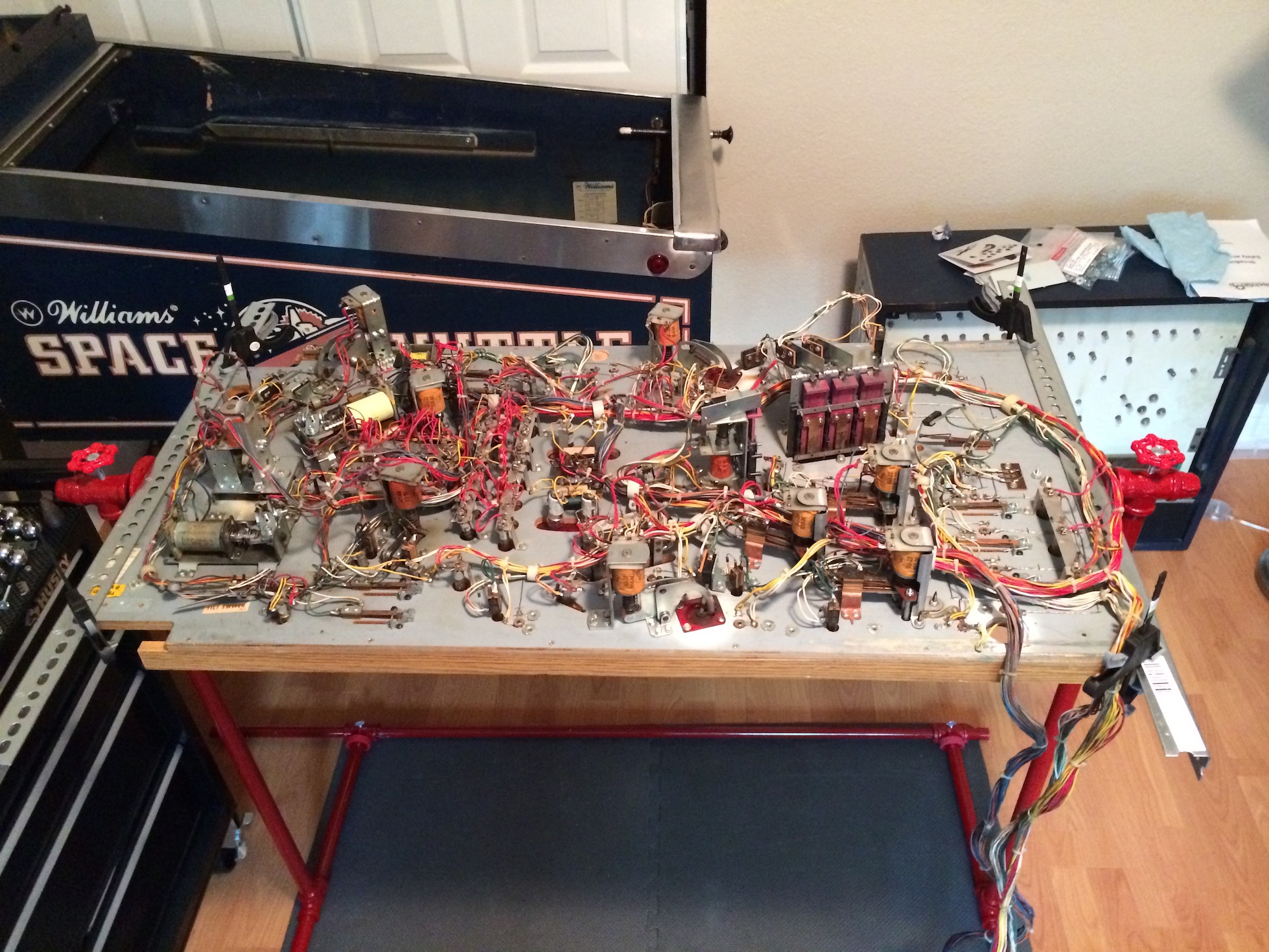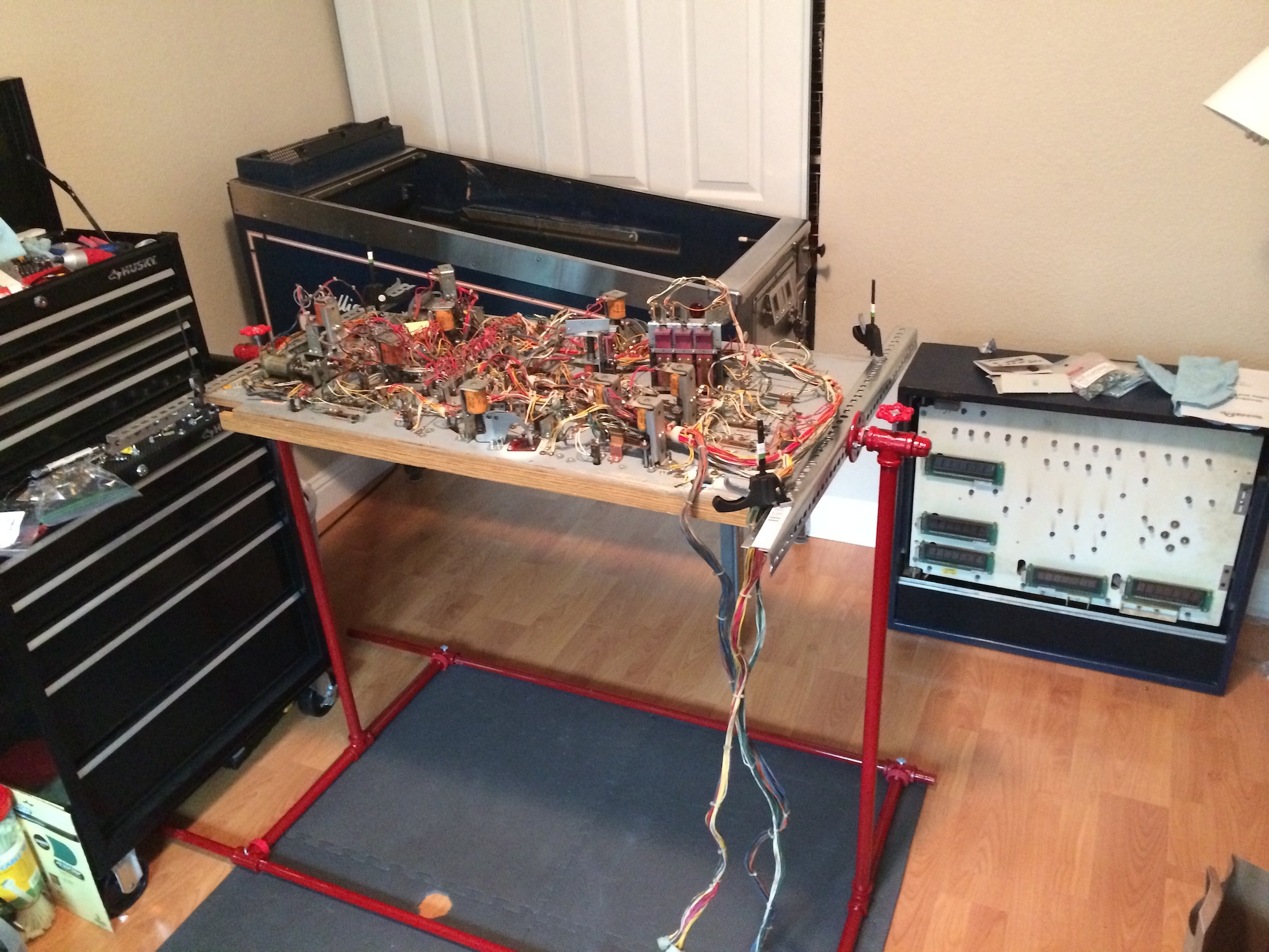 Yes, I got some red paint on the garage floor π Lesson learned! Here it is after final assembly and with the Space Shuttle playfield mounted on it: