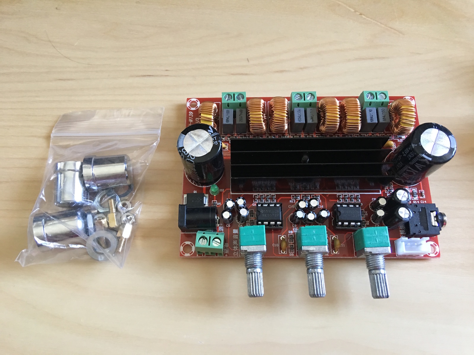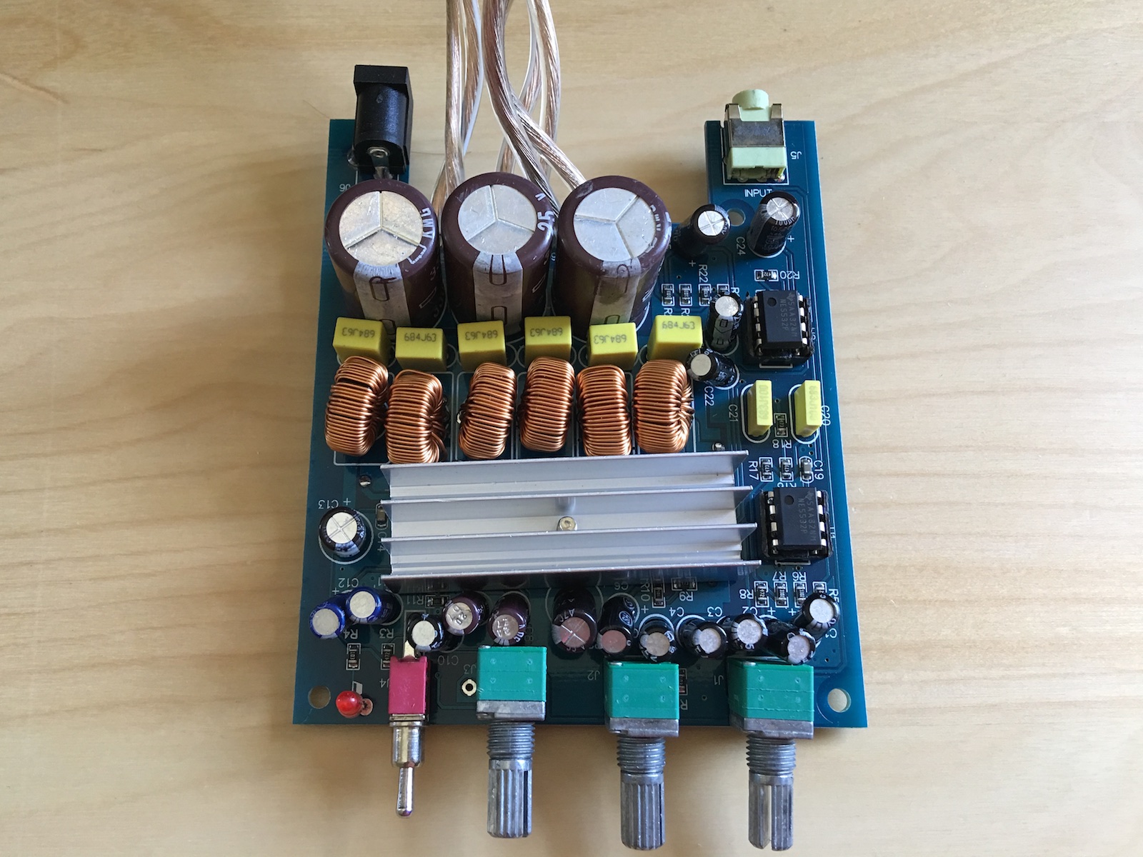 The TPA3116D2 is a popular chip by Texas Instruments used these days in audio amps. It’s very power efficient and hence doesn’t need a large heatsink. Small complete boards using these chips are extremely cheap and readily available on eBay for between 10$ and 20$ including shipping! I did a bit of reading on them online and it seems like results are mixed – but at those prices why not take a gamble and buy a few different ones to test them out? They seem like too good of an option to pass up, especially compared to other options for amps which can easily get in the 100$+ range. I bought three different ones in the “2.1” configuration (two main channels plus a subwoofer channel), each under 20$, hoping for at least one “good” one. I hooked them up to some small speakers plus an 8″ sub for testing. Here are my observations after listening to each for a few hours.