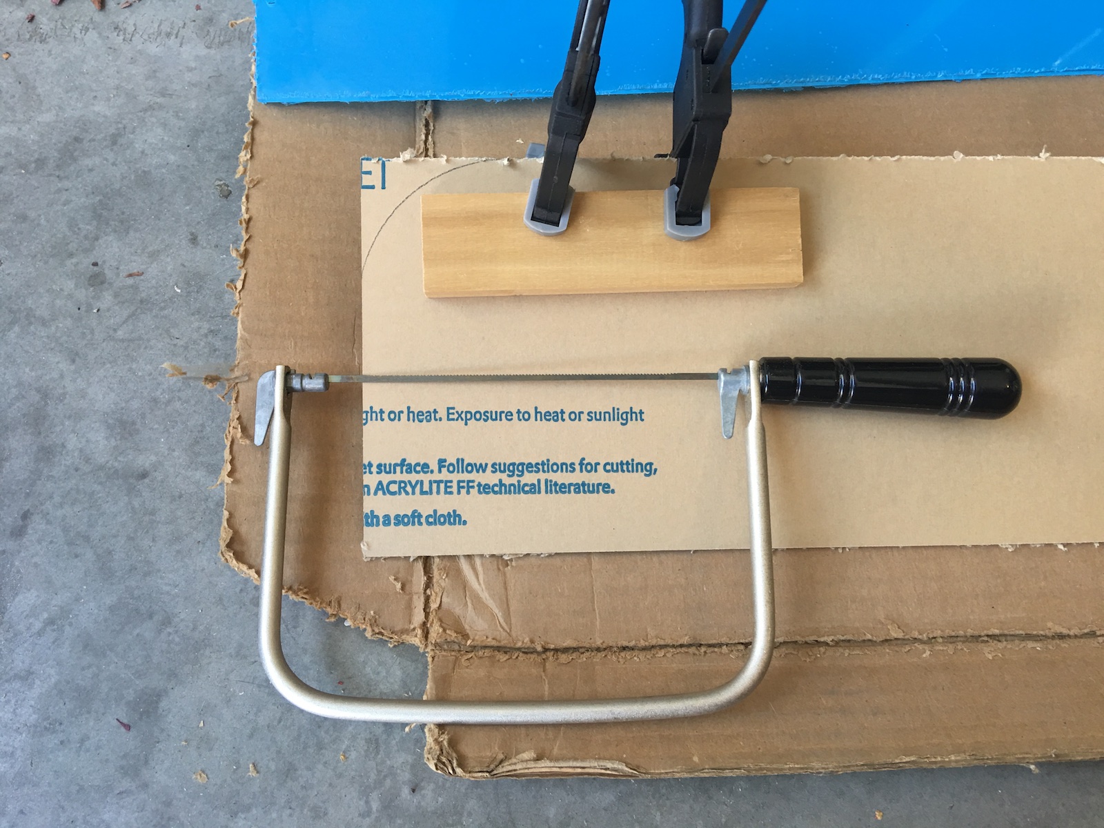 Tap Plastics cut my acrylic to the proper size, but there are still a few items that need taking care of – rounding the corners and drilling some holes. I clamped some wood blocks to each side to give the material some stiffness and started with the coping saw to cut the rounded corners, using the original panel as a template. Acrylic is a very hard material and it quickly became obvious doing a rounded corner wouldn’t be easy…