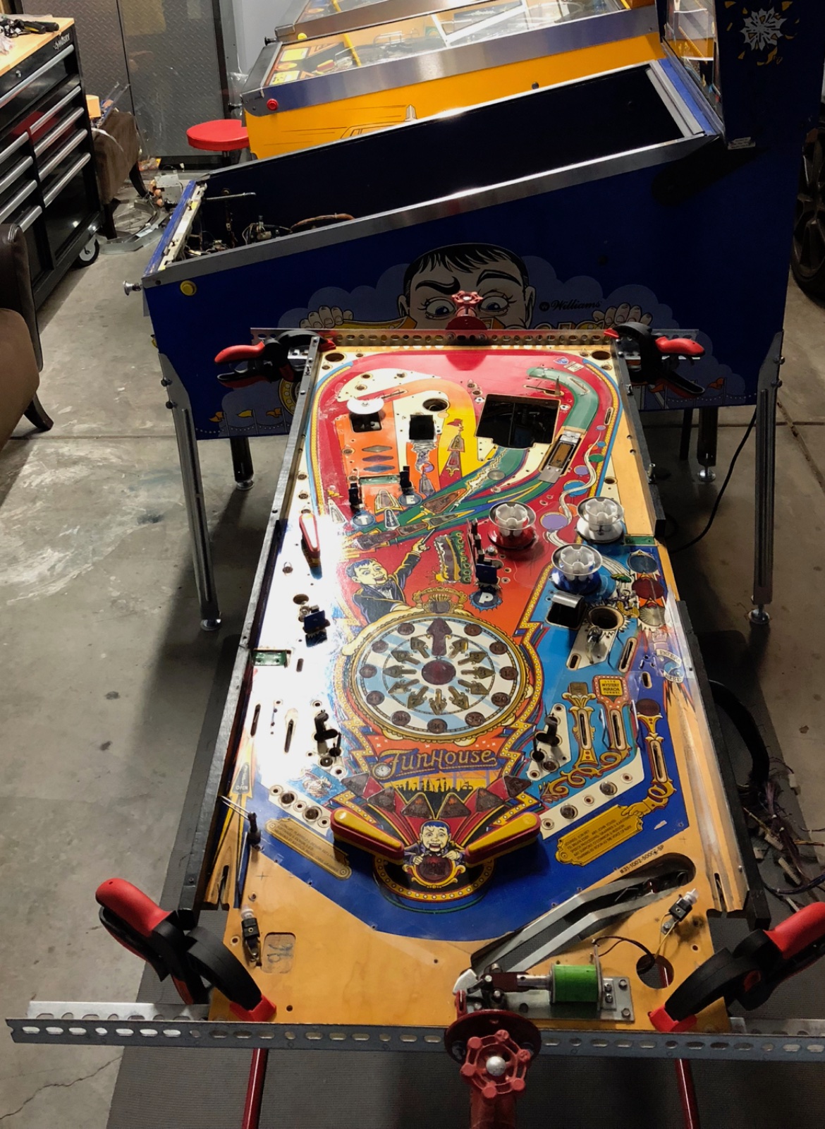 Over the last few weekends, I’ve undertaken a new pinball project – swapping the playfield in my Funhouse, Pat Lawlor’s awesome game from 1990. My game was playing well, but definitely wasn’t the prettiest Funhouse out there. The clock inserts in the center of the playfield, in particular, were particularly worn: