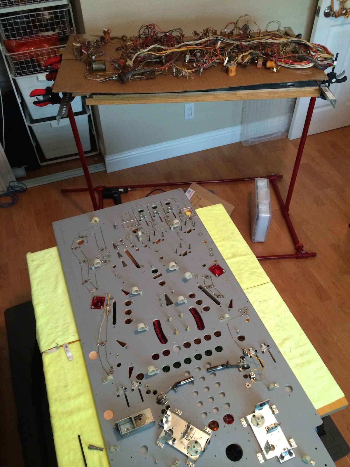 Here’s the old playfield on the rotisserie – every component except the ball through ball guide is unattached and simply sitting on the playfield. Rotating the rotisserie at this point would be a disaster 🙂