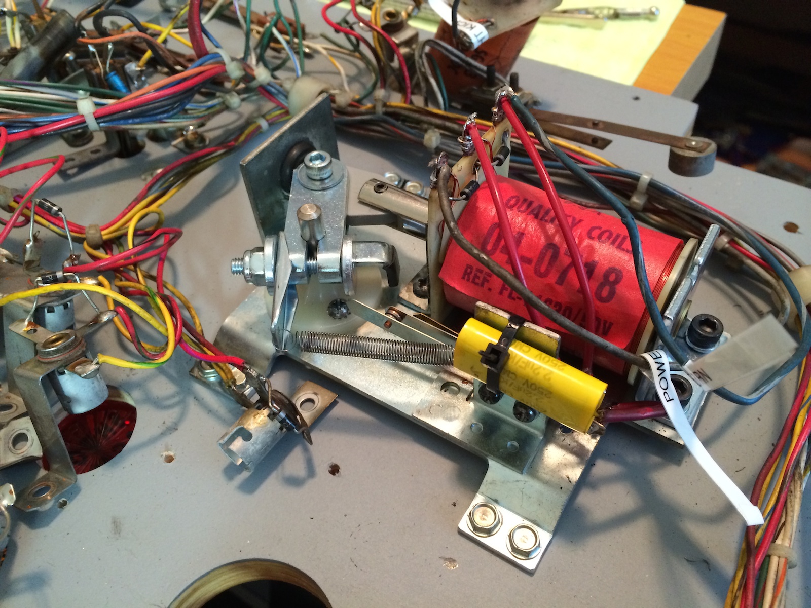First, in preparation for the transfer, I finally made it all the way to the bottom of both the old and new playfields. It took several work sessions to finish disassembling the old one and pre-drill all the pilot holes on the new one. Some of the major assembly brackets such as the flippers and half of the kickers are also installed. Here’s what the new playfield looked like when it was ready to accept the wiring harnesses: