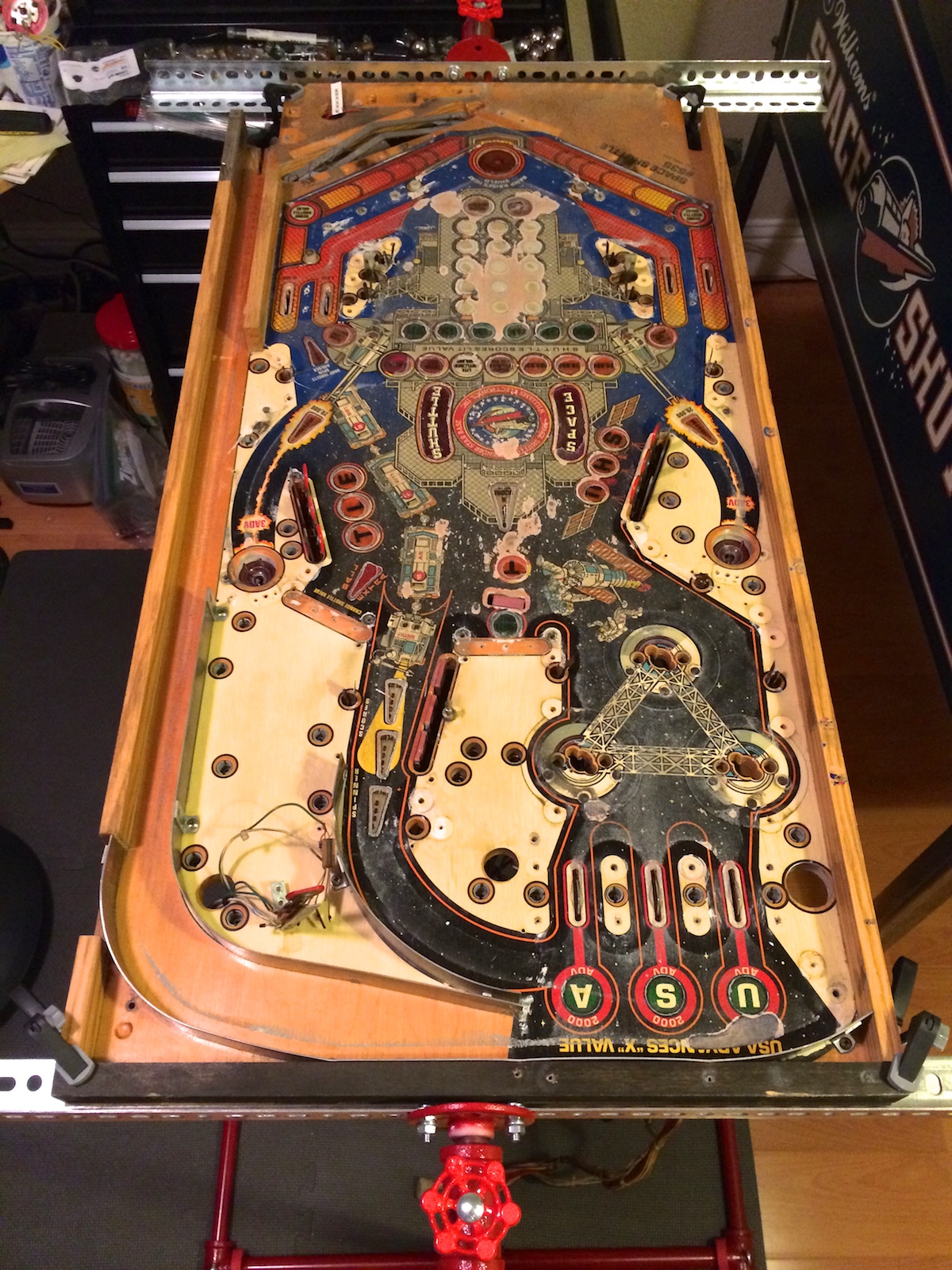 Setting the playfield swap project aside for a bit, I started working on the cabinet restoration. My cabinet is in pretty good shape overall, with very few nicks and a couple small gouges, but the paint on it is severely faded – not too surprising given its age. My plan is to re-paint the cabinet using spray paint and stencils for the artwork, which is three colors (navy blue, red, and white). In preparation for this, all the metal trim and hardware has to come off. Most pieces are held on with nuts and bolts and are trivial to remove. The exceptions are the stainless steel side rails, held on with twist nails. These nails have a round head and were clearly not designed to be ever removed!