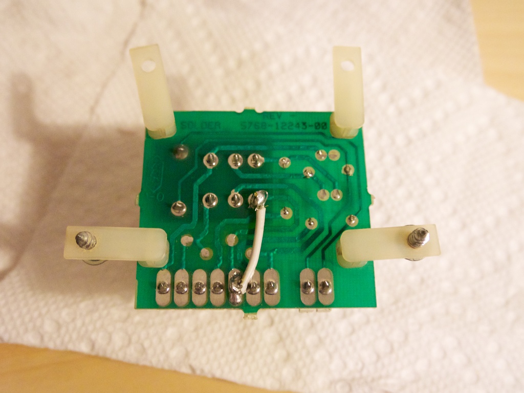 So, why was only half of the GI out? The GI is split into two different circuits, both of which pass through the relay, which actually is like two different relays in one as it has two independent circuit switches (but only one coil). Using my multimeter, it became clear that although both sets of normally-closed pins had continuity (and thus were OK), only one of the two circuits had continuity to the molex header pins that interface the board. It could only be a bad trace on the board, so I soldered on a jumper cable to restore the circuit.